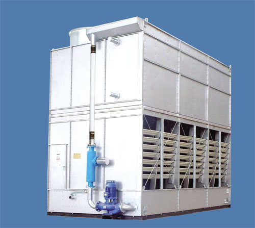 蒸發(fā)式冷凝器以水和空氣為冷卻介質(zhì),與盤管內(nèi)的高溫氣態(tài)冷卻進行熱交換,制冷劑由氣態(tài)冷凝成液態(tài)。冷凝器內(nèi)部設(shè)水分配系統(tǒng)、冷凝盤管組、填料熱交換層、閉式冷卻塔、除水器等;外部設(shè)循環(huán)水泵、電子水垢儀、盤管側(cè)面頂部設(shè)軸流風(fēng)機。在軸流風(fēng)機作用下,冷凝室內(nèi)部成負壓狀態(tài)。工作時,冷卻水經(jīng)水分配系統(tǒng),在強勁風(fēng)力作用下均勻的完全覆蓋在盤管表面,高溫氣態(tài)制冷劑從盤管上部進入,被冷凝的液態(tài)制冷劑從盤管底部流出,在該過程中,高溫制冷劑與盤管外的水、空氣進行熱交換,再借助風(fēng)勢,換熱效果顯著提高。冷卻水和空氣吸熱后溫度升高,部分冷卻水汽化形成水蒸氣,蒸發(fā)帶走大量熱量,由風(fēng)機吸走排入大氣。熱空氣中的水份被除水器截留集水池中,沒有被氣化的高溫冷卻水流入填料熱交換層被流經(jīng)的空氣帶走熱量使其冷卻,閉式冷卻塔、經(jīng)充分冷卻后的冷卻水流回集水池中供循環(huán)泵重新送入水分配系統(tǒng)繼續(xù)循環(huán)工作,散失到大氣中的水份由集水池內(nèi)的水浮球閥給予及時補充。