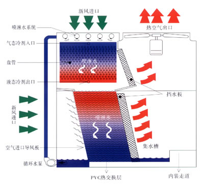 蒸發(fā)式冷凝器運(yùn)行原理:進(jìn)入冷凝盤管的高溫氣態(tài)制冷劑通過盤管壁與盤管外側(cè)噴淋水和空氣進(jìn)行熱交換,制冷劑氣體的溫度隨著在管內(nèi)的時(shí)間加長(zhǎng)而下降,由氣態(tài)逐漸變成液態(tài)。用風(fēng)機(jī)超強(qiáng)風(fēng)力,使噴淋水充分覆蓋在盤管外表面上,從而提高了換熱效率。噴淋水和空氣吸收盤管壁的熱量后溫度升高,部分水由液態(tài)變成氣態(tài),帶走管壁上大量熱量,濕熱空氣中的水份被擋水板截住引入PVC熱交換層中,熱空氣排出。PVC熱交換層中的水被流過的新風(fēng)冷卻,溫度降低,流入集水槽中,再由水泵送入噴淋系統(tǒng)中,繼續(xù)循環(huán)。散失到空氣中的水份由水位控制裝置自動(dòng)調(diào)節(jié)補(bǔ)充。