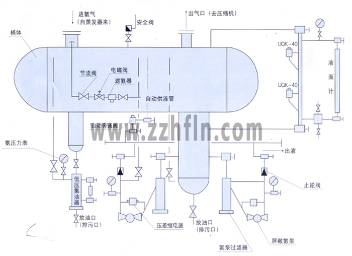 本系列組合裝置將臥式低壓循環(huán)貯液桶和兩臺離心屏蔽氨泵組裝在同一鋼架上,工藝管路,閥門,自控元件,電氣元件,均已裝配齊全,構(gòu)成桶泵一體化供液裝置。本系列組臺裝置具有自動供液,液位顯示,液高報警,氨泵自動保護,自動或手動操作等功能。