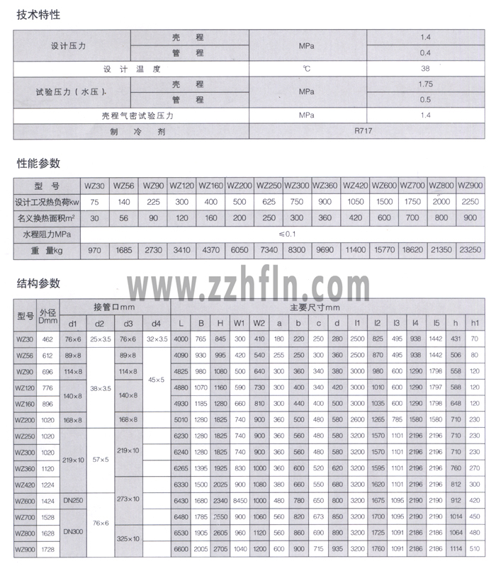 WZ系列蒸發(fā)器為臥式殼管式結(jié)構(gòu),高壓氨液節(jié)流后進(jìn)入蒸發(fā)器的殼體內(nèi),在殼體和格機(jī)管外的空間蒸發(fā)。吸收管內(nèi)載冷劑(水或鹽水)熱量,造成低溫以冷卻水,鹽水或其它介質(zhì)。