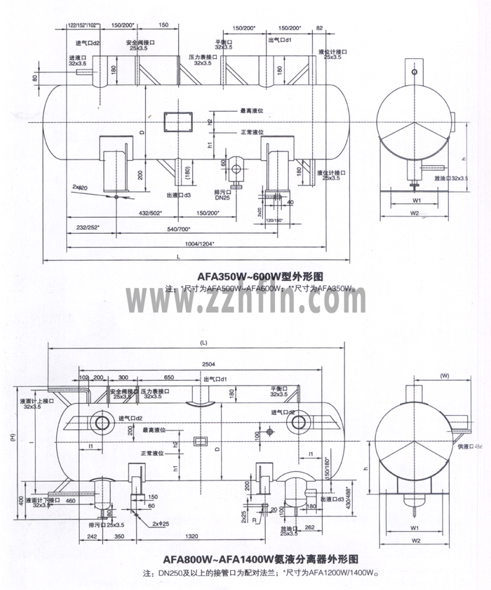 AFA-W系列氨液分離器為臥式結(jié)構(gòu),來自蒸發(fā)器的氨氣從設(shè)備一端或兩端的進氣管進入,分離液滴后從設(shè)備的另一端或中間的出氣管被壓縮機吸走。