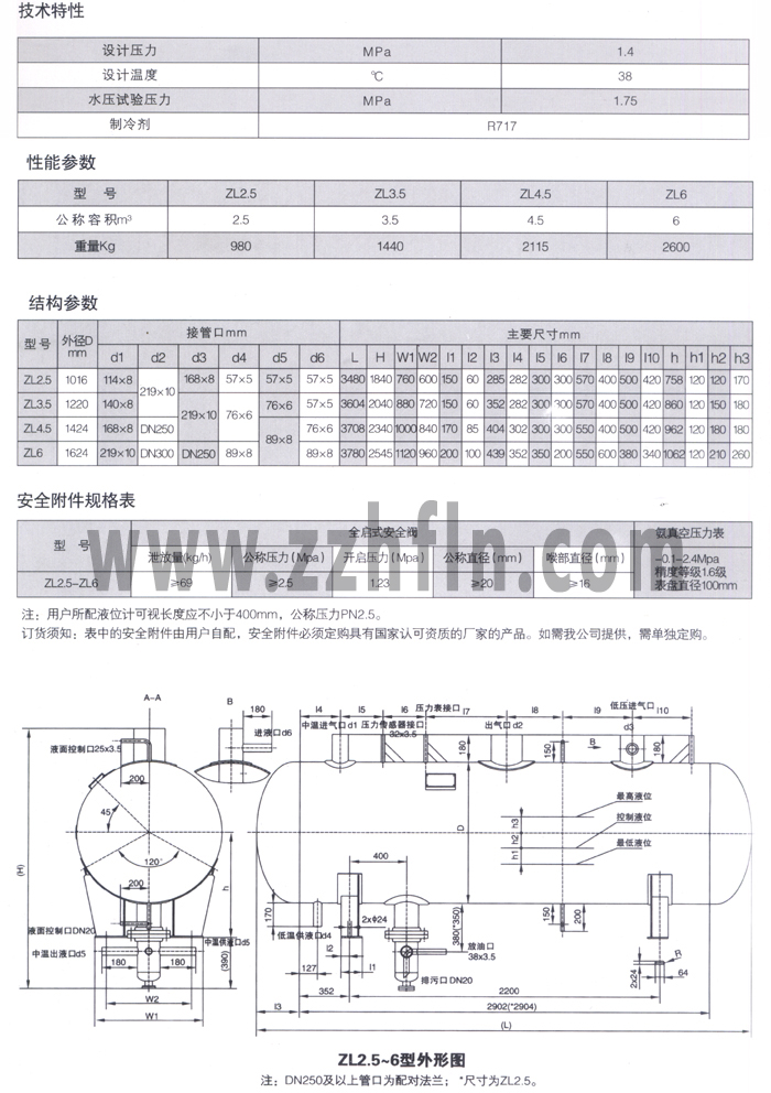 ZL系列中間冷卻器用于二級節(jié)流中間完全冷卻系統(tǒng)。高壓貯液器來的液體,經過節(jié)流后從低壓級排汽口進入中間冷卻器;從低壓級壓縮機來的氨氣進入中間冷卻器液面以下洗滌降溫后,同中溫蒸發(fā)器回來的進行氣液分離后的氨氣一同被高壓級壓縮機吸走。同時一部分液體從下面油包處中溫出液口被氨泵送往中溫蒸發(fā)器,另一部分液體經再次節(jié)流后,供低溫蒸發(fā)器使用。