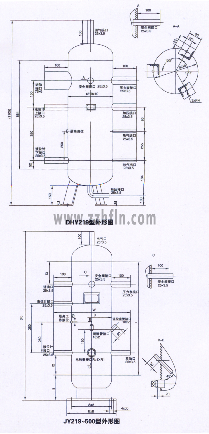 集油器在制冷系統(tǒng)中用以收集制冷設備中的潤滑油,并將收集的潤滑油排除制冷系統(tǒng)。 我公司的集油器有DHY、JY兩個系統(tǒng)。其中DHY-219用于低壓回油。