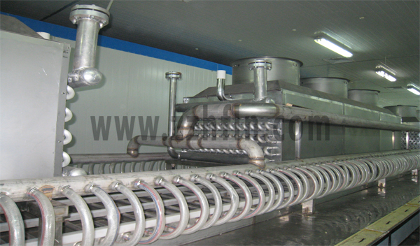設(shè)豎向?qū)эL(fēng)裝置,冷風(fēng)從擋風(fēng)板縫隙噴出,使食品重復(fù)受到強(qiáng)弱不同的豎吹風(fēng)而冷凍,實(shí)現(xiàn)熱波動(dòng)凍結(jié)方式,效率比一般橫向吹風(fēng)凍結(jié)方式提高20%~30%,并且可通過(guò)導(dǎo)風(fēng)裝置調(diào)節(jié)風(fēng)速,以適應(yīng)不同產(chǎn)品的速凍加工要求。