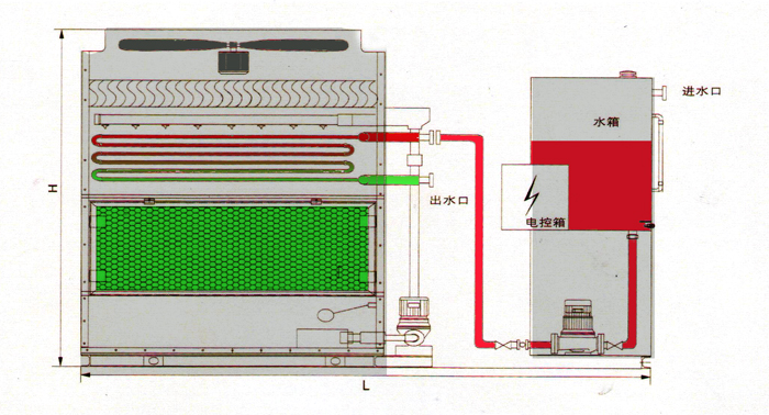 該系列閉式冷卻塔已經(jīng)集成了主機、循環(huán)泵、循環(huán)水箱和控制箱。在管道連接上,以整流柜冷卻為例。用戶將軟化水接入循環(huán)水箱內(nèi)。循環(huán)水泵從軟化水箱內(nèi)吸水,然后泵入冷卻塔內(nèi)。經(jīng)過冷卻塔冷卻后的軟化水,被送入整流柜。然后在整流柜內(nèi)被分散輸送到各個晶閘管及整流電子元件中。從整流柜回來的高溫水,被送回循環(huán)水箱,再一次被水泵泵入冷卻塔冷卻,進行第二次循環(huán)。